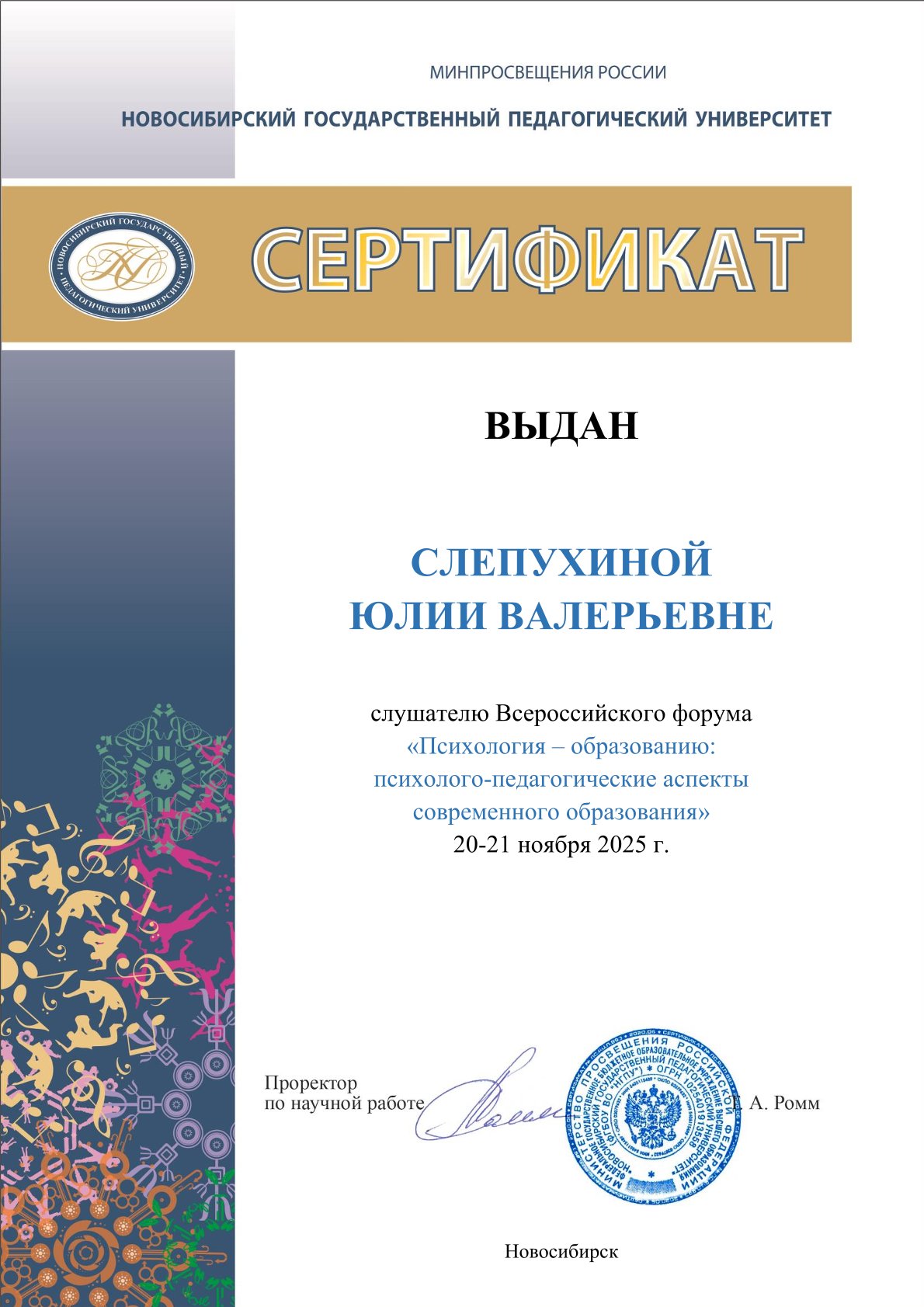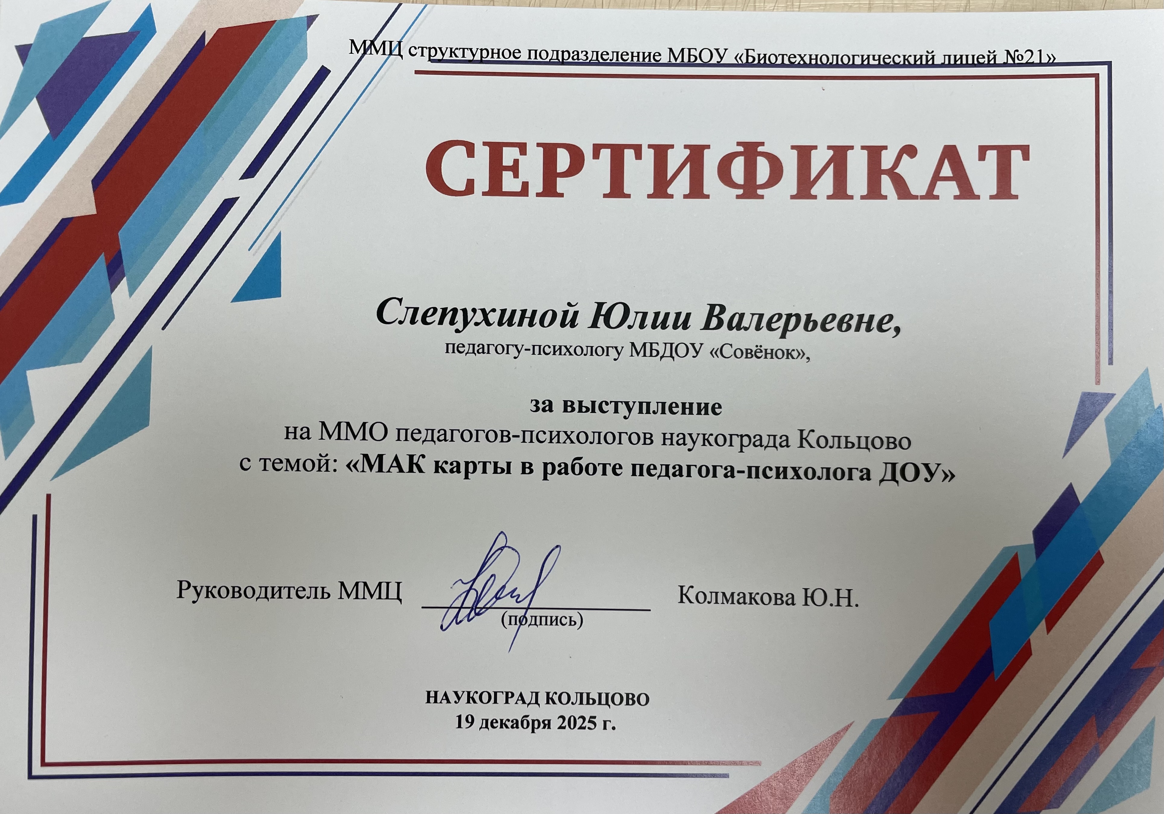 Сертификат за выступление на ММО педагогов-психологов наукограда Кольцово.